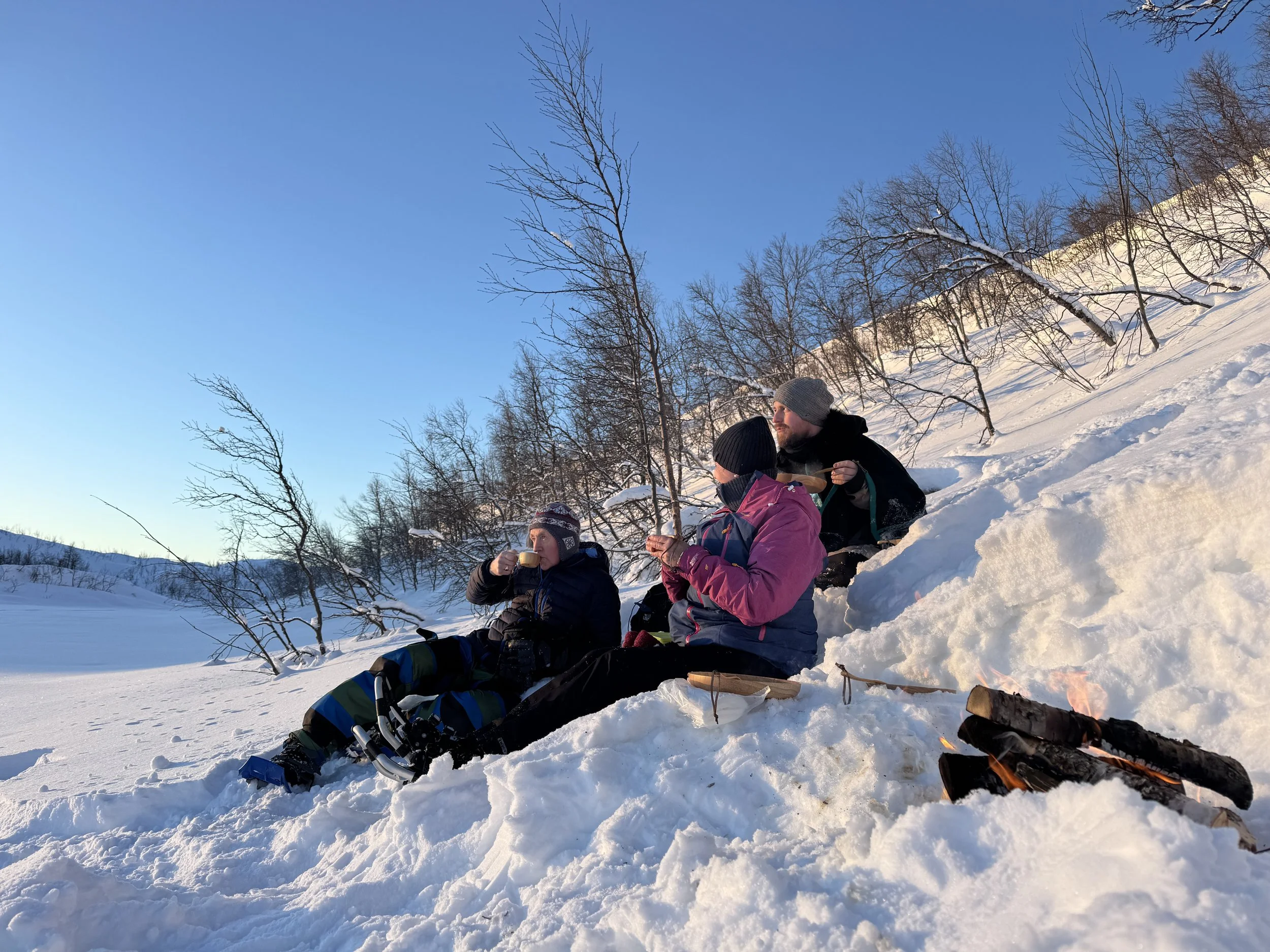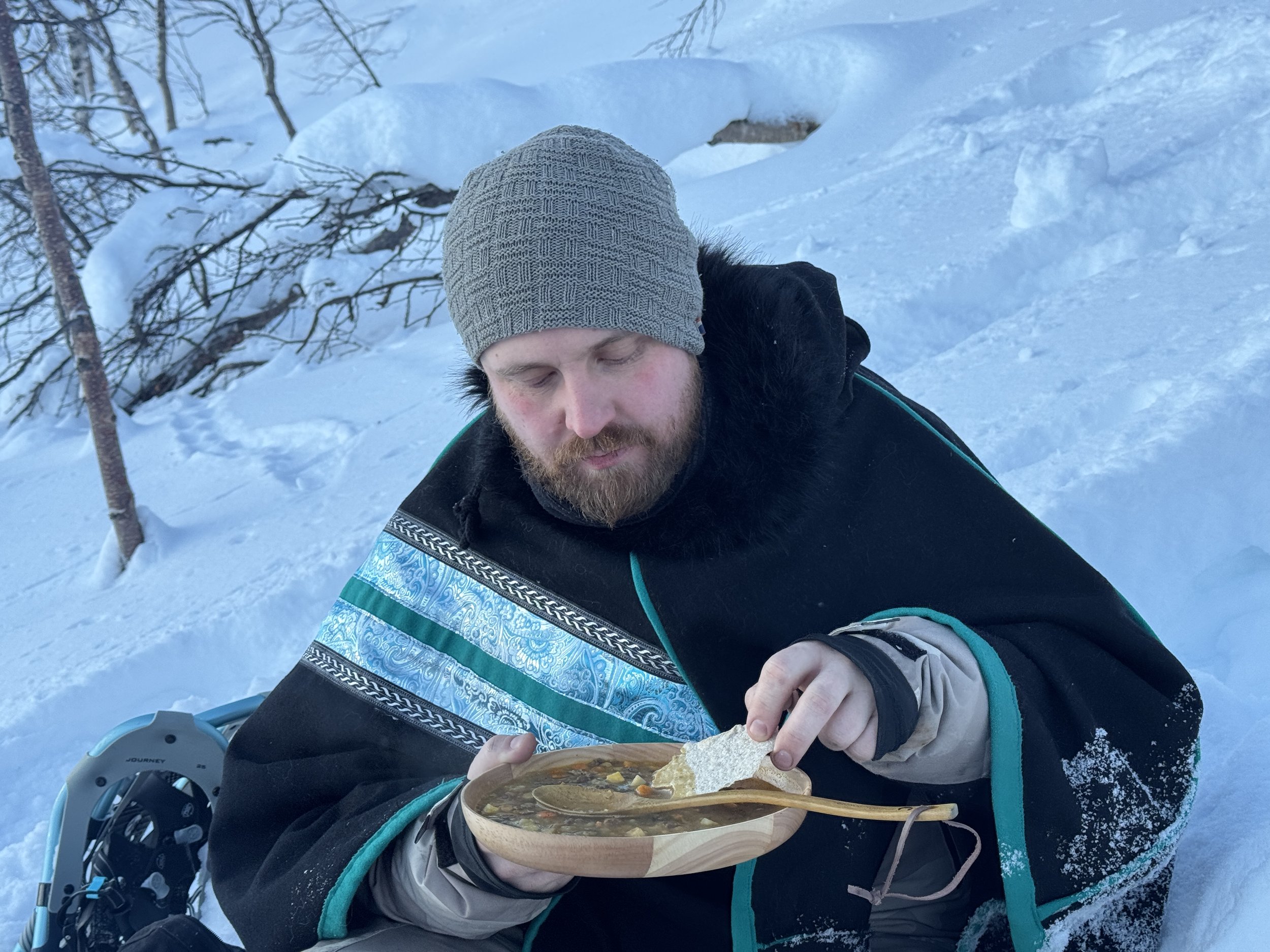 During the hike, warm up around an open fire where hot raindeer soup and hot drinks are prepared and served outdoors — the perfect way to enjoy your winter outing surrounded by nature.
